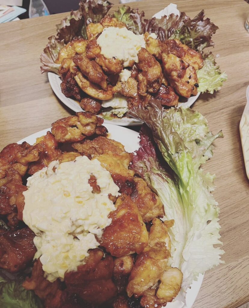 友人と合わせて男3人分なのでボリューム満点の写真です!甘酢のタレやタルタルソースも自分たちで作ってみました!